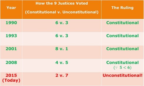 Today’s case: Out of the 9 Justices presiding, 7 saw Article 241 as “unconstitutional,” while the remaining 2 saw it as “constitutional.” Hence the “unconstitutional” ruling today. FYI, Article 241 was reviewed a total of 5 times by the Constitutional Court. (See chart at the very top.) Fifth time was the charm.