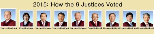 In Korea, the Constitutional Court (not the Supreme Court) reviews the constitutionality of laws. All 9 Constitutional Court Justices normally preside in a given case. For a law to be found “unconstitutional” (and be repealed), a minimum of 6 votes (out of 9) are required.