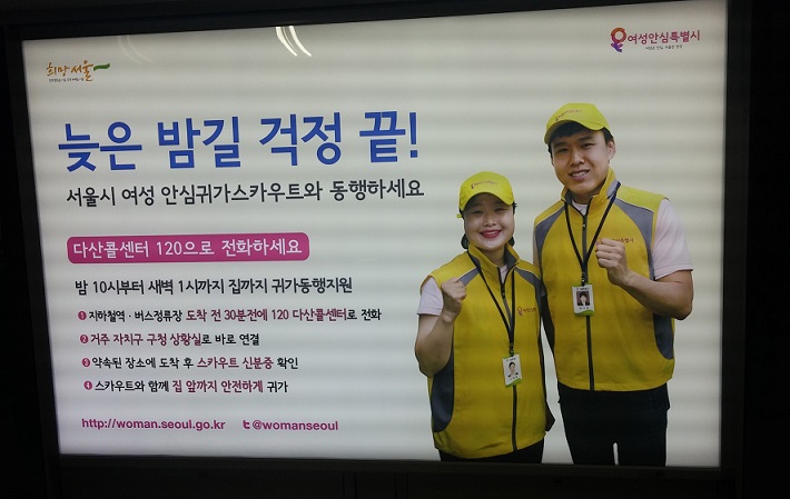 Some districts in Seoul are currently running something called “Safe Return Home for Women Service” (여성 안심귀가 서비스). If you are a woman returning home late at night (i.e., 10 p.m. – 1 a.m.), you can call 120 (about 30 minutes before you arrive at a subway station or bus stop) and ask to be escorted by a “scout” to your home. The scout will show up, and you may check his/her credentials. Then, you can be escorted to your home free of charge. If you live in Seoul, you might want to make use this service. Also, many 24-hour convenience stores in Seoul are now designated “Temporary Safe Haven for Women” (여성 안심 지킴이집). If you see the yellow/black sticker on the entrance of a convenience store, you can take refuge there if you ever feel someone is stalking/following you or is up to no good. Those convenience stores have signed an MOU with the police and thus have a hotline system. They can easily and quickly call the police (on your behalf).