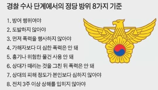 In 2011, the Korean police set forth new guidelines on how to determine and investigate self-defense cases. 8 factors are taken into consideration when determining if self-defense could be recognized (during investigations). They are as follows: