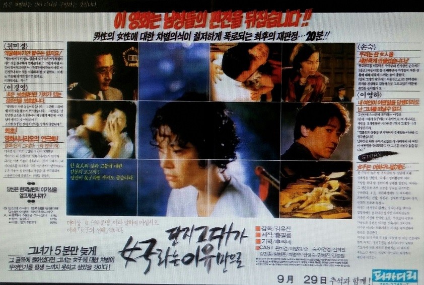 Biting off someone’s tongue (who tries to forcibly kiss you) is recognized as self-defense in Korea. It was first recognized as such in 1988 by an appellate court. Up until then, such a response was seen as being excessive (and thus not self-defense). The 1988 incident/case was even made into a Korean movie titled, Only Because You Are a Woman (1990). Poster above. As you can see, it came out around Chuseok in 1990! FYI, a case in 2012 once again recognized such a response as self-defense.