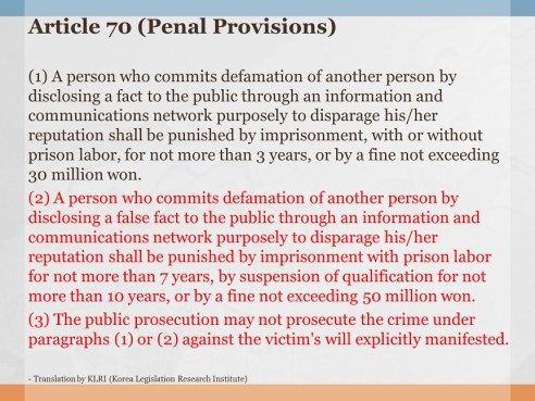 In Korea, when defamation is perpetrated online (i.e., “Cyber Defamation”), the Act on Promotion of Information and Communications Network Utilization and Information Protection, etc. (정보통신망이용촉진및정보보호등에관한법률) is applied first, in place of the Criminal Act (형법). (In such case, the Criminal Act serves as a “backup.”) Please see the slide at the top of this post. Articles 70(2) and 70(3) apply to this particular case.