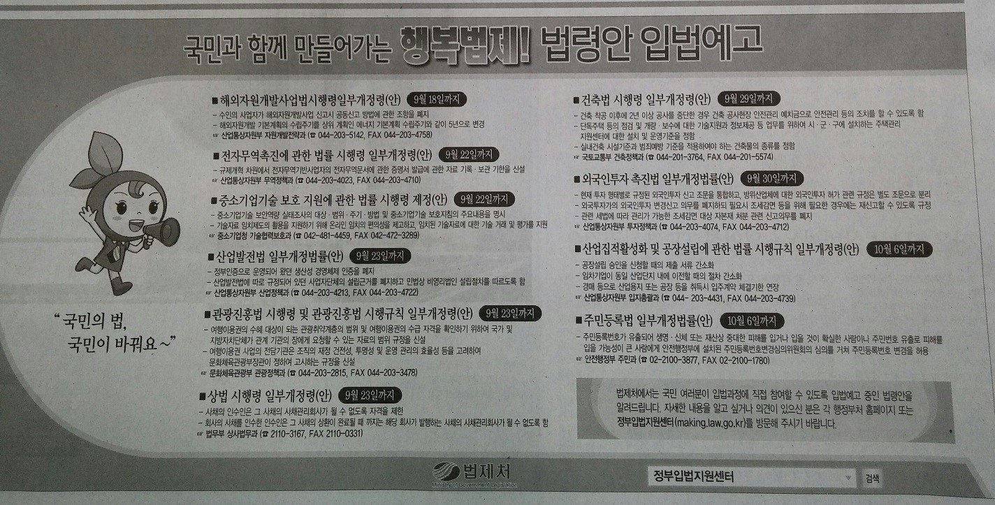 1) In Korea, laws are continually + frequently enacted/revised. Unless the existing law is explicitly being revised, the enactment of a new law does not automatically repeal the existing law. They coexist. It’s just that a new law takes precedence in instances where the two collide (i.e., say different things about the same matter). This is because new laws tend to be the more specific/detailed laws. In Korean law, an all-too-common mistake is to apply an old/general law without realizing that a new/special law has (recently) been enacted. One example: It is wrong to (first) apply the Criminal Act (형법) when criminal defamation is perpetrated online. In such case, the Act on Promotion of Information and Communications Network Utilization and Information Protection, etc. (정보통신망이용촉진및정보보호등에관한법률) always takes precedence. (Nowadays, most defamation is actually perpetrated online.) This is why Korean law can be tricky (even for me). Above photo: Newspaper notice announcing the impending revision of existing laws and the enactment of new ones. Citizens, too, can take (some) part in the legislation process by giving feedback before a deadline.