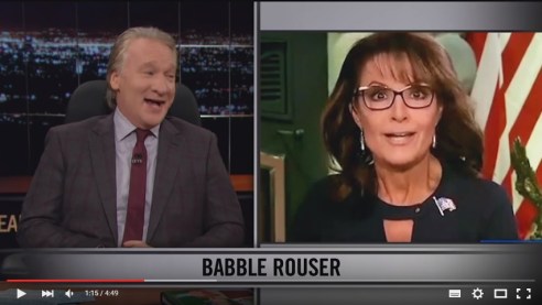 Bill Maher: “Now that many Republicans have come forward in the last week to finally admit that ‘okay you were right; Sarah Palin is a crazy person,’ they have to ask themselves what else might I have been completely wrong about all these years. Now in case you missed it, Palin made a speech in Iowa a couple of weeks ago that cryptologists are still working on. And which I had been holding off on discussing on the outside chance it might be brilliant in some other language. Let’s look at a few moments, shall we, to see for oursleves what prompted conservatives to finally throw Sarah Palin under the bus.”