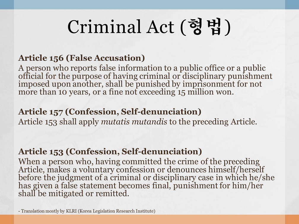 These are sort of the things I had to memorize for the multiple-choice section of the (Korean) Bar Exam. There are many more cases regarding “False Accusation,” but I chose to share the above 12 for the time being.