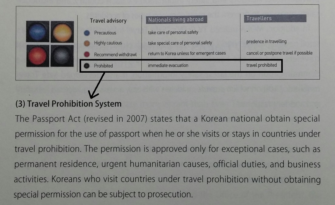 Article 17(1): When deemed necessary to suspend any visit to or sojourn in any specific overseas country or region in order to protect the lives, physical safety and property of people against dangerous circumstances in locations oversea prescribed by Presidential Decree, such as a natural disaster, war, internal disturbance, revolt, terror, etc., the Minister of Foreign Affairs may impose restrictions on the use of a passport or prohibit any visit to and sojourn in the relevant country or region (hereinafter referred to as “restrictions, etc. on the use of passports”), setting a period: Provided, That the Minister of Foreign Affairs may, if he/she deems it necessary, grant permission on the use of a passport, visit or sojourn for any travel to be made for purposes prescribed by Presidential Decree, such as permanent residence, reporting, urgent humanitarian causes, official duties, etc.