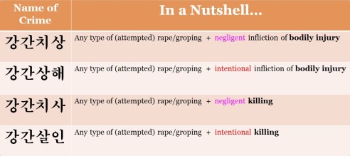 3. For “강간치상” and “강간치사,” the result (i.e., bodily injury or death) should have been (relatively) foreseeable. In a case where the rape victim died while trying to escape (via jumping out the window), the Korean Supreme Court recognized the crime of “강간치사” (98도724).