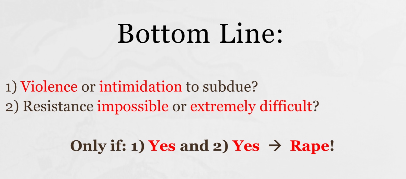 The court felt the woman did not actually use violence or intimidation as a means to have sex. The husband did say no, but he could have resisted if he had really wanted to. The prosecution failed to prove beyond a reasonable doubt there was a “lack of consent” (meaning there could have been consent).